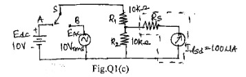 Determine the reading obtained with a de voltmeter in the circuit Fig.Q1(c). When the switch is set to position 'A', then set the switch to position 'B' and determine the reading obtained with a HWR and FWR ac voltmeter.