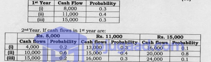 X Ltd. is considering the purchase of a new plant requiring a cash outlay of Rs. 20,000. The plant is expected to have a useful life of 2 years without any salvage value. The cash flows and their associated probabilities for the two years are as follows: