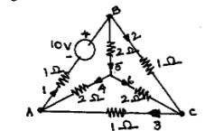 For the network shown in the following figure, draw the oriented graph. By selecting branches 4, 5 and 6 as twigs, write down tie-set schedule. Using this tie-set schedule, find all the branch currents and branch voltages.