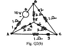 For the network shown in Fig. Q2(b), draw the oriented graph. By selecting braches 4, 5 and 6 as twigs, write down tie-set schedule. Using this tie-set schedule, find all the branch currents and branch voltages.