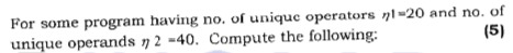 For a program with the number of unique operators n1 = 40 and number of unique operands n2 = 60, compare the followings: (i) Program Volume