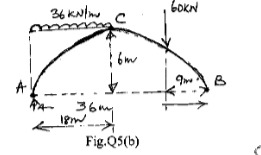 A three hinged parabolic arch is loaded as shown in Fig.5(b). Determine the reactions at supports, normal thrust, radial shear and bending moment at left quarter span point.
